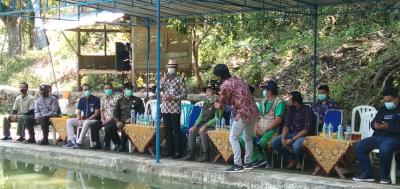 Gunungkidul – Bupati H. Sunaryanta bersama ketua DPRD Endah Subekti Kuntariningsih, SE menebar 10 ribu bibit ikan jenis nila di dua telaga, yaitu Telaga Jurangjero dan telaga Wanglor yang berada di kapanewon Panggang, pada hari Jumat 9 april 2021 pagi