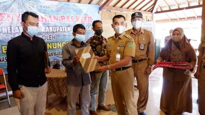 Bupati H.Sunaryanta secara simbolis menyerahkan dokumen legalitas PAS kepada perwakilan nelayan di dampingi kepala Dinas Kelautan dan Perikanan drh.Krisna Berlian, pimpinan Bank BPD.