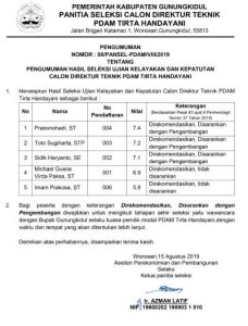 Pengumuman Seleksi Ujian Calon Direktur Teknik PDAM Tirta Handayani