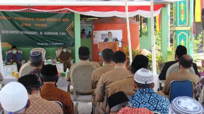 Gunungkidul – Bupati Gunungkidul Hj badingah, S.Sos hadir dalam peletakan batu pertama renovasi pembaguman masjid Subardi Al-Huda, Tembesi, Kuwon Ponjong Gunungkidul, Selasa( 1/9).[PIC2]