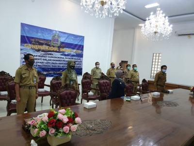 Gunungkidul – Bupati Hj. Badingah,S.Sos menyampaikan pemamaparan pada penilaian (assessment) program gerakan menuju smart city pada kawasan pariwisata prioritas nasional dan ibukota negara baru secara virtual di Rumah Dinas Bupati, Selasa (29/9).