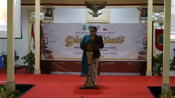 Gunungkidul – Bupati Gunungkidul, Endah Subekti Kuntariningsih, menghadiri acara Dharma Santi Kabupaten Gunungkidul sebagai puncak peringatan Hari Raya Nyepi Tahun Saka 1948/2026 Masehi yang dilaksanakan di Bangsal Sewokoprojo, Sabtu (18/04/2026).Kehadiran Bupati dalam acara tersebut merupakan bentuk nyata dukungan Pemerintah Kabupaten Gunungkidul terhadap penguatan nilai-nilai toleransi dan persaudaraan di tengah keberagaman masyarakat Bumi Handayani.