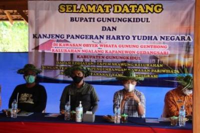 Gunungkidul – Program Pengembangan Sektor Pariwisata mewujudkan Pariwisata mendunia sesuai misi Bupati tentang pariwisata selain investasi dan ekonomi kerakyatan, terus di akselerasi dengan gerak cepat dan konsolidiasi pada kesempatan ini  Bupati H.Sunaryanta menggelar pertemuan dengan  kanjeng pangeran Haryo (KPH) Yudha Negara, di kawasan Obyek Wisata Gunung Genthong Ngalang Kapanewon Gedangsari,Sabtu (3/4).