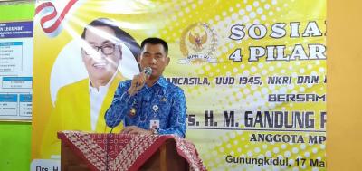 Gunungkidul – Sosialisasi 4 pilar oleh Anggota MPR RI Drs.H.Gandung Pardiman, MM Dari partai Golkar yang dilaksanakan di Balai Padukuhan Legundi Kalurahan Panjan Saptosari di hadiri Bupati H.Sunaryanta, Rabu (17/3).