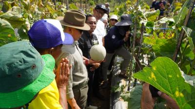 Gunungkidul – Bupati Gunungkidul bersama Kelompok Tani Tani Maju melakukan panen perdana Rock Melon di Bulak Munggur, Cikal, Kalurahan Watusigar, Kapanewon Ngawen, Jumat (26/7/2024).