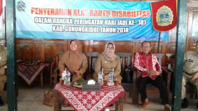 Kepala Dinas Sosial, Siwi Irianti melaporkan,pemberian alat bantu disabilitas bpdidasarkan pada Perda No. 18 Tahun 2017 tentang APBD TA 2018 yang tertuang pada keputusan pejabat pengelola keuangan daerah No. 25/DPA/2018 tentang DPA-PD 2018 pada Dinas Sosial. Program peningkatan rehabilitsi sosial dengan kegiatn penyelenggaraan rehabiliasi sosial dan pengarusutamaan disabilits salah satu sub kegiatannya adalah memberikan alat bantu disabilitas pada tahun 2018 sebanyak 145 unit yang terbagi di 8 kecamatan, khusus hari ini di Kecamatan Wonosari berjumlah 24 unit yang terinci 13 unit kursi roda dan 14 unit alat bantu dengar.