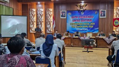 Gunungkidul – Persiapan jelang Perayaan Hari Besar Keagamaan dan libur panjang, Polres Gunungkidul bersama dengan Pemerintah daerah Kabupaten Gunungkidul menggelar Rapat Koordinasi Lintas Sektoral Pengamanan Natal 2024 dan Tahun Baru 2025, Ruang Handayani, Kantor Sekretariat daerah Gunungkidul, Kamis (19/12/2024).