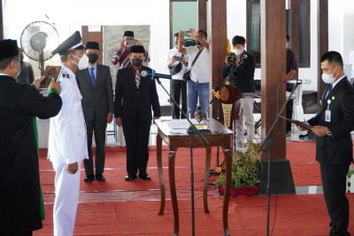 [PIC1] Gunungkidul – Sesuai Surat Keputusan Bupati No. 141/05/PG/KPTS/2022, Bupati Sunaryanta resmi mengambil sumpah lurah Agus Sulistyo, A.Md sebagai Lurah Baleharjo Kapanewon Wonosari, Senin(24/1) di Pendopo Balai Kalurahan Baleharjo.