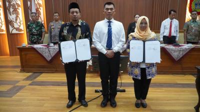 Penandatanganan NPHD dilakukan oleh Bupati Gunungkidul Sunaryanta, Ketua KPU Gunungkidul Asih Nuryanti dan Ketua Bawaslu Gunungkidul Andang Nugroho disaksikan jajaran Forkompimda.