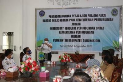 Gunungkidul – Bupati Hj. Badingah, S.Sos melaksanakan penandatanganan kerjasama pinjam pakai gedung terminal Dhaksinarga yang akan dipergunakan sebagai Mall Pelayanan publik.