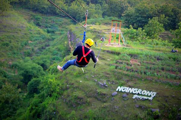 English: Tourists that visiting the Ngingrong Geosite area must try the flying fox ride. The sensation of flying over the Ngingrong gorge with a depth of 85 meters and a cable length of 150 meters will be a memorable holiday experience. When gliding in the air can be witnessed the beautiful natural scenery of Geosite Ngingrong from above the altitude while enjoying the typical rural air. Equipment safety procedures refer to European safety standards with heavy loads that can accommodate up to 150kg of sliding cable. Visitors do not need to worry about security standards that have been applied to minimize accidents.