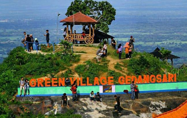 English: Green Village is located in Gedangsari District, Gunungkidul Regency, at this location visitors can feel the sensation of gliding with the longest flying fox in Southeast Asia. The length of the flying fox trajectory is 625 km, with a track along which visitors can glide at speeds reaching 80km / hour. Security facilities standards are also of international standard. When sliding tourists can enjoy the green panorama of rice fields. In the Green Village area there are also gazebos – gazebos for relaxing to enjoy the beauty of the natural scenery in the form of green hills around it. Public facilities are also available, such as toilets, parking areas, photo spots and viewing posts.
