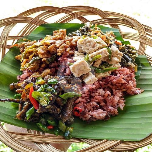 English:Healthy cuisine in the village, it seems appropriate to describe the typical food of Gunungkidul. Red rice served with complementary side dishes such as vegetable lombok ijo, papaya leaf vegetables, fried empal, fried chicken, tofu and soybean cake. This food is a typical food with recipes from generation to generation from the natives of Gunungkidul. If you are visiting Gunungkidul, it is a pity to miss this special food dish.