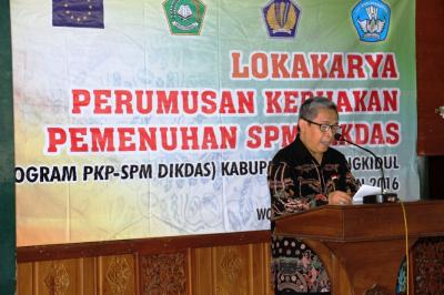 Untuk meningkatkan keberhasilan pendidikan Pemerintah Kabupaten Gunungkidul terus berupaya mengatasi permasalahan yang ada melalui sejumlah kebijakan maupun program, salah satunya adalah menuangkan implisit target pemenuhan SPM Dikdas pada RPJMD Kabupaten Gunungkidul tahun 2016 – 2021, yang dilaksanakan dalam bentuk lokakarya pada hari ini Rabu, 12 Oktober 2016 di Bangsal Sewokoprojo Wonosari, Kabupaten Gunungkidul.