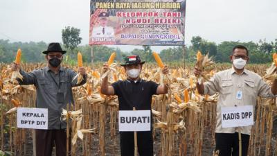 Gunungkidul – Bupati H.Sunaryanta melakukan panen perdana jagung hibrida bersama Kelompok Tani Ngudi Rejeki Dusun Tugu Kalurahan Sumberejo Kapanewon Semin, Kamis(13/1).
