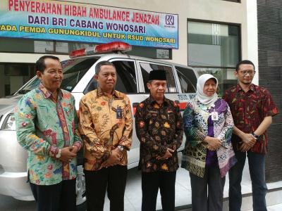 RSUD Wonosari menerima hibah bantuan satu unit ambulance dari BRI Cabang Wonosari, Jumat(10/6). Hibah ambulance ini disambut baik oleh Kepala RSUD Wonosari drg. Isti Indriyani. “RSUD Wonosari mempunyai 13 spesialisasi, hampir tiap bulan mengantar jenazah ke luar kota, bahkan bisa 3- 4 kali, 90% pasien RSUD Wonosari menggunakan jaminan yang bekerja sama dengan BRI, termasuk tenaga kontaknya juga bekerjsama dengan BRI”, katanya. Selain itu pihaknya berharap RSUD mendapatkan layanan hotspot dalam rangka mempercepat layanan informasi.[PIC3]