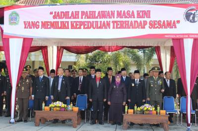 Bertempat di Alun-Alun Wonosari Upacara Peringatan Hari Pahlawan 10 Nopember 2016 berjalan tertib dan lancar. Hadir pada kesempatan itu antara lain Bupati Hj.Badingah S Sos, Wakil Bupati Dr.Drs.H.Immawan Wahyudi SH MH, Ketua DPRD Suharno SE, Dandim 0730/GK Letkol Inf Muh.Taufik Hanif Y S.Sos, Kepala PN Muh. Buchary K Tampubolon SH MH, Kajari M.Fauzan SH MH, Para Pejabat di jajaran Pemkab Gunungkidul, anggota DPRD, para perwira di lingkup TNI dan Polri, Legiun Veteran Republik Indonesia (LVRI).[PIC2]