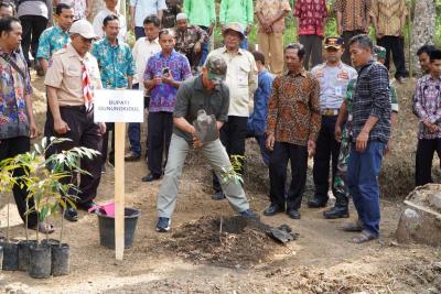 Gunungkidul -Bupati Gunungkidul, Sunaryanta memimpin gerakan tanam 1000 pohon durian yang dipusatkan di Kalurahan Tambakromo, Kapanewon Ponjong. Kamis, (3/8/2023).