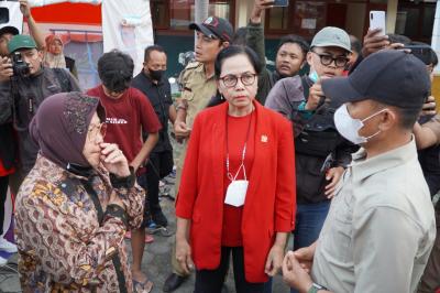 Gunungkidul – Menteri Sosial, Tri Rismaharini mengunjungi lokasi pengungsian warga yang terdampak longsor di Semin, Gunungkidul.