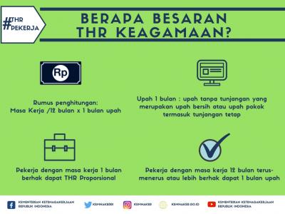 Berdasarkan Permenaker No.6/2016 pekerja/buruh yang mempunyai masa kerja 1 bulan berhak mendapatkan THR Keagamaan dari perusahaan. Pekerja/buruh yang bermasa kerja 12 bulan secara terus menerus atau lebih maka mendapat THR sebesar satu bulan upah.[PIC1]
