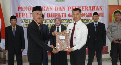 Gunungkidul – Bupati Gunungkidul, Sunaryanta menyaksikan pengukuhan dan menyerahkan keputusan bupati tentang perubahan masa keanggotaan Badan Permusyawaratan Kalurahan (Bamuskal) se Kapanewon Ngawen dan Semin. Penyerahan SK di laksanakan di masing- masing kantor kapanewon, Kamis (11/7/2024).