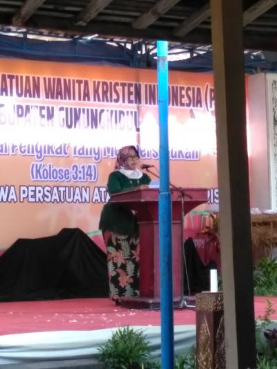 Dalam sambutannya Bupati Badingah menyampaikan beberapa hal, antara lain bahwa Persatuan Wanita Kristen Indonesia sudah banyak mendukung pemerintah daerah dalam semua program kegiatan, dan sebagai organisasi perempuan, Persatuan Wanita Kristen Indonesia mempunyai peran yang penting dalam peningkatan SDM untuk berperan dan berkontribusi nyata dalam meningkatkan pembangunan. “Saat ini Gunungkidul masih terus meningkatkan sektor pariwisata, dengan demikian peran ibu-ibu sangat penting untuk mendorong kemajuan pariwisata, seperti kader PKK, kader lingkungan, kader PAUD, dan lain sebagainya. Akan tetapi tentunya perjuangan kaum perempuan sangatlah diperlukan dukungan dari kaum bapak untuk memperkuat dan mewujudkan program tersebut”, pungkas bupati.