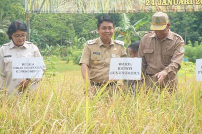 Gunungkidul- Senin (24/01/2023) bertempat di Padukuhan Klampok, Kalurahan Giripurwo, Kapanewon Purwosari, Wakil Bupati Gunungkidul menghadiri panen raya padi dengan varietas segreng handayani.