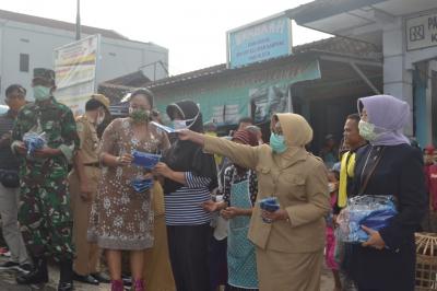 Bupati Gunungkidul Hj. Badingah,S.Sos., bersama Ketua Pelaksana Gugus Tugas Penanganan Vovid-19 (Wakil Bupati) Dr. Immawan Wahyudi,MH dan Ketua DPRD Endah Subekti Kuntariningsih, SE., Pimpinan BPD Cabang Wonosari Plati Sulistyowati membagikan 10.000 masker kepada masyarakat di pasar Karangduwet kecamatan Paliyan dan Pasar Playen Kecamatan Playen. Selasa(21/04).