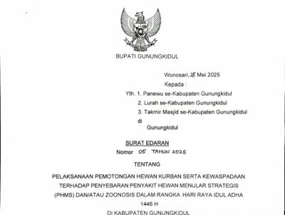 Gunungkidul– Menjelang Hari Raya Idul Adha 1446 Hijriah, Pemerintah Kabupaten Gunungkidul mengeluarkan Surat Edaran Nomor 05 Tahun 2025 tentang pelaksanaan pemotongan hewan kurban serta kewaspadaan terhadap penyebaran Penyakit Hewan Menular Strategis (PHMS) dan/atau zoonosis.