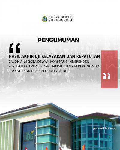 Pemerintah Kabupaten Gunungkidul melalui Panitia Seleksi mengumumkan Hasil Akhir Uji Kelayakan dan Kepatutan (UKK) Seleksi Calon Direktur Bisnis PT. BPR Bank Daerah Gunungkidul (Perseroda).