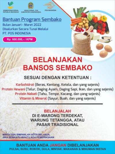 Gunungkidul – Untuk Percepatan Penyaluran Bansos Sembako/BPNT periode Januari s/d Maret Tahun 2022 maka penyaluran Bantuan Sosial Program Sembako/BPNT dilaksanakan pada bulan Februari – Maret Tahun 2022, yang akan disalurkan melalui PT. POS Indonesia dalam bentuk tunai.