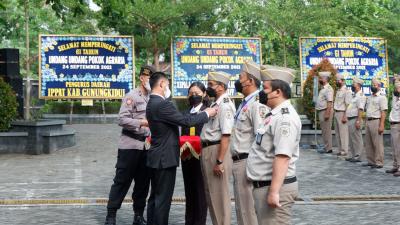 Gunungkidul – Peringatan 61 tahun Undang-Undang Pokok Agraria di peringati dengan upacara terbatas pegawai negeri sipil BPN Gunungkidul dengan pembina upacara Bupati H.Sunaryanta, Jumat (24/9) di halaman kantor ATR BPN jl.Ki Demang Wonopawiro Ringroad Utara.