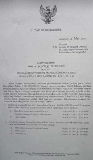 Sesuai dengan surat edaran Nomor 003/2291 Tahun 2019, tentang Perubahan Ketentuan Pelaksanaan Jam Kerja Selama Bulan Suci Ramadhan 1440 H/2019 M, Jam kerja bagi instansi pemerintah daerah dan unit kerja di Kabupaten Gunungkidul adalah 32,5 jam per minggu. Dengan ketentuan sebagai berikut :