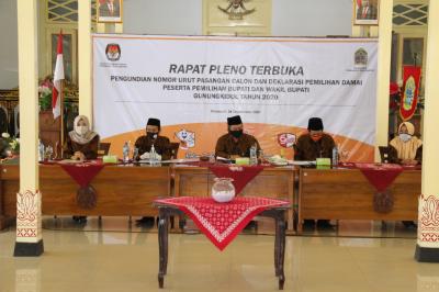 Gunungkidul – Komisi Pemilihan Umum (KPU) Gunungkidul menggelar rapat pleno terbuka pengundian nomor urut pasangan calon dan deklarasi pemilihan damai peserta pemilihan bupati dan wakil bupati Gunungkidul tahun 2020 di Bangsal Sewokoprojo, Kamis (24/9).[PIC4]