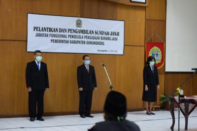 Gunungkidul-Sekretaris daerah Ir. Drajad Ruswandono, MT., Melantik dan mengambil sumpah janji Pejabat Fungsional pengelola pengadaan barang/jasa pemkab Gunungkidul di RR I Setda Gunungkidul. Kamis (14/05).