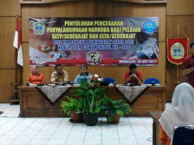 Gunungkidul – Pemerintah Daerah terus berupaya memerangi peredaran narkoba, yang sudah mulai merasuki dan merusak generasi penerus bangsa ini. Melalui Badan Kesatuan Bangsa Politik Perlindungan Masyarakat, Pemerintah Kabupaten Gunungkidul melaksanakan Penyuluhan Pencegahan Penyalahgunaan Narkoba Bagi Pelajar, Sabtu (20/05), bertempat di Ruang Rapat I Setda Kab. Gunungkidul. Kegiatan ini masih merupakan rangkaian acara hari jadi Kabupaten Gunungkidul yang ke – 186.