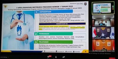 Gunungkidul- Wakil Bupati Gunungkidul, Heri Susanto menghadiri secara daring Launching Instruksi Presiden Nomor 1 Tahun 2022 tentang Optimalisasi Pelaksanaan Program Jaminan Kesehatan Nasional yang diselenggarakan oleh Kementerian Pembangunan Manusia dan Kebudayaan di Ruang Rapat Wakil Bupati dengan didampingi Asisten Pemerintaha dan Kesejahteraan Rakyat, Siwi Irianti, Kepala Bagian Kesejahteraan Rakyat, Azis Saleh, Kepala BPJS Gunungkidul dan dari Dinas Kominfo, Suyanto, Kamis (03/02)