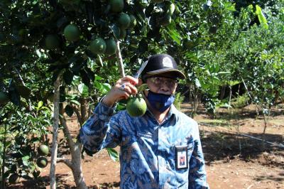 Wakil Bupati Gunungkidul Dr. Immawan Wahyudi,MH berkesempatan mengunjungi dan memanen langsung di lokasi kebun jeruk seluas 6,5 hektar. Jumat (12/06). Lahan kebun jeruk yang terbagi menjadi 2 lokasi tersebut dikunjungi wakil bupati, meskipun di area kebun pertama wakil bupati harus berjalan kaki sejauh 100 meter menyusuri tegalan, namun rasa lelah terobati dengan hamparan lahan seluas 1,5 hektar yang penuh dengan pohon jeruk dengan penanaman yang rapi dan berbuah sangat lebat, memasuki lahan kebun tersebut aroma jeruk sudah terasa melintas di hidung di dukung lokasi yang sejuk dan segarnya udara.[PIC3]