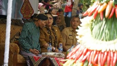 “Saya pengen bersama-sama warga Serut berdoa, sedekah bumi atau merti desa supaya warga di sini ketika menanam bisa tumbuh panen banyak, yang berdagang mendapat untung, yang memiliki kebutuhan banyak segera terpenuhi, supaya doa baik bisa terkabul. Saya senang sekali melihat gunungan di sini, ada padi, ada kacang, ada jeruk. Semoga sayur-sayuran ini nanti tidak perlu beli tapi bisa menanam sendiri, dan yang kita tanam bisa tumbuh subur,” kata Bupati.