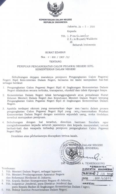 Sehubungan dengan maraknya penipuan Pengangkatan Calon Pegawai Negeri Sipil di lingkungan Kementerian Dalam Negeri, dengan ini telah ditetapkan Surat Edaran Menteri Dalam Negeri Nomor : 800/1907/SJ tentang Penipuan Pengangkatan Calon Pegawai Negeri Sipil Kementerian Dalam Negeri tertanggal 24 Mei 2016 (terlampir). Berdasarkan edaran dimaksud, dimohon seluruh masyarakat untuk berhati-hati dan waspada terhadap penipuan pengangkatan Calon Pegawai Negeri Sipil, berikut Surat Edarannya :